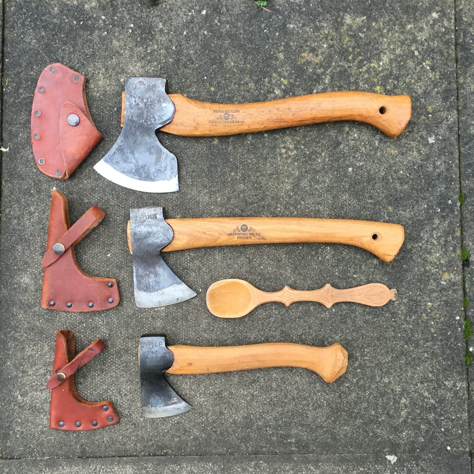 Some members of the Gransfors Bruk family of axes. From the top; the large carving axe, the wildlife hatchet and the small carving axe