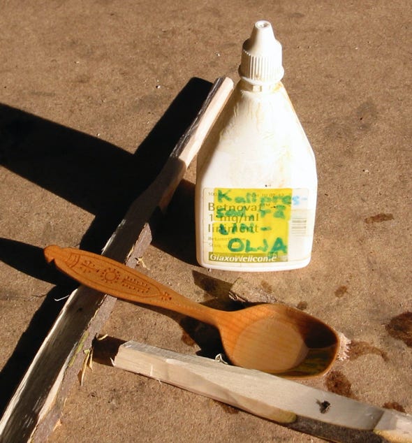 A spoon carved by Wille Sundqvist being treated with ‘Linolja’, Swedish for linseed oil