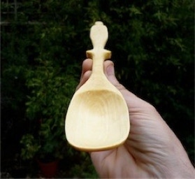 This spoon has been carved from willow, a very light coloured wood. The linseed oil finish has given it a distinctive yellow hue